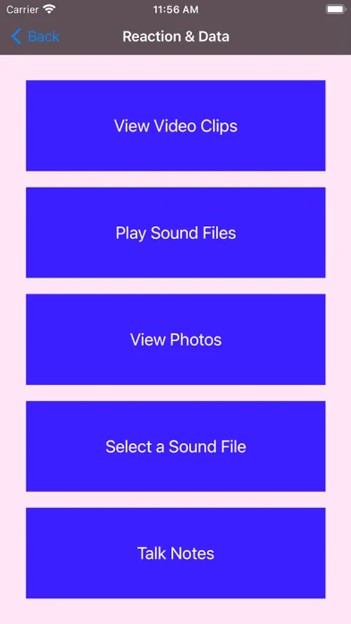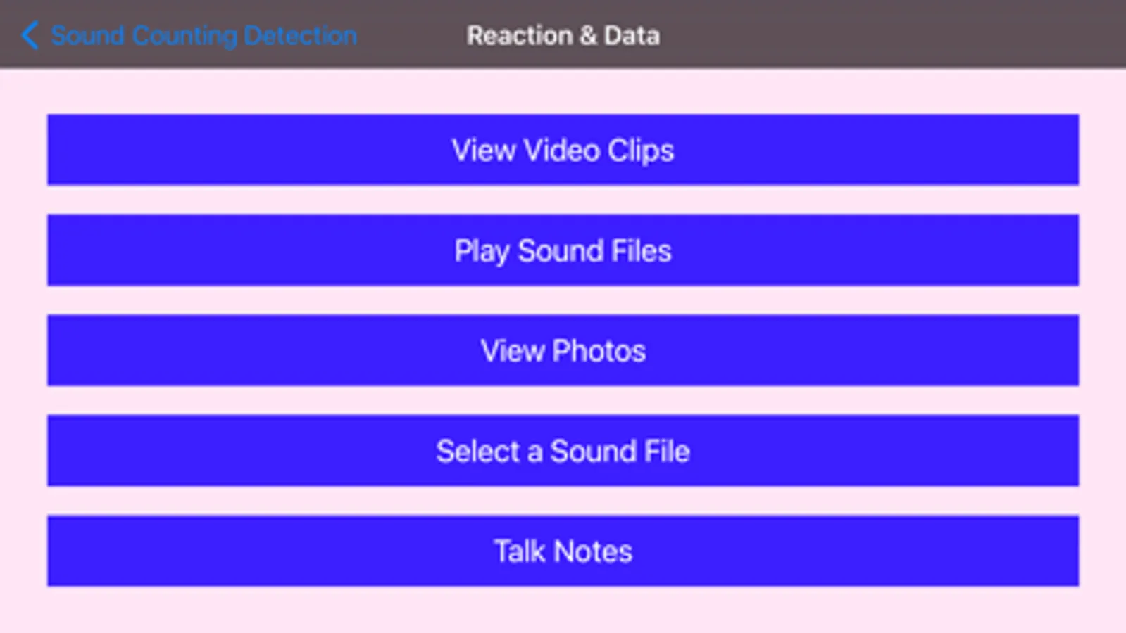 From the reaction+data view, we could edit the notes for talking and we could select which sound file should be played, and we could also view the photos and video clips taken by this app.