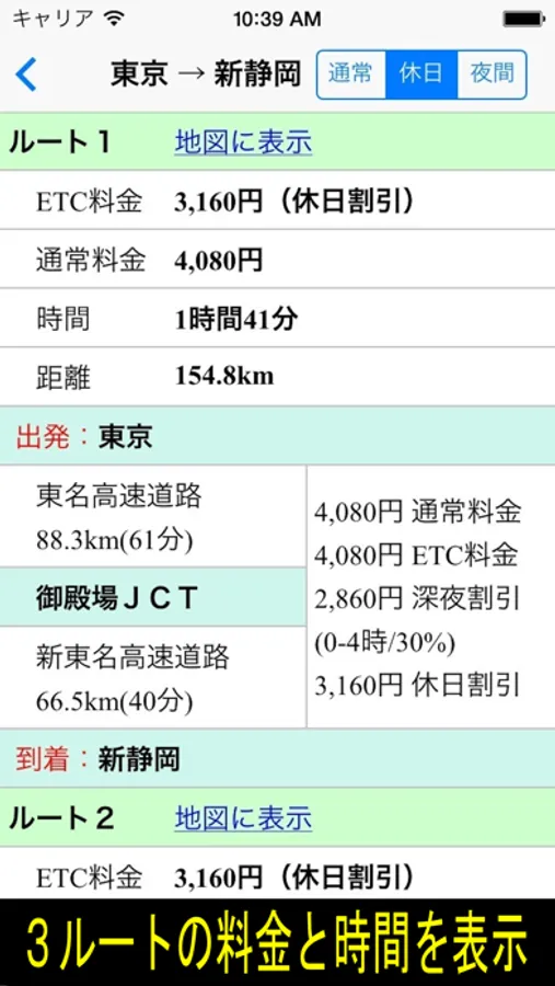 高速道路の料金、ルート、時間、距離を検索するアプリです。