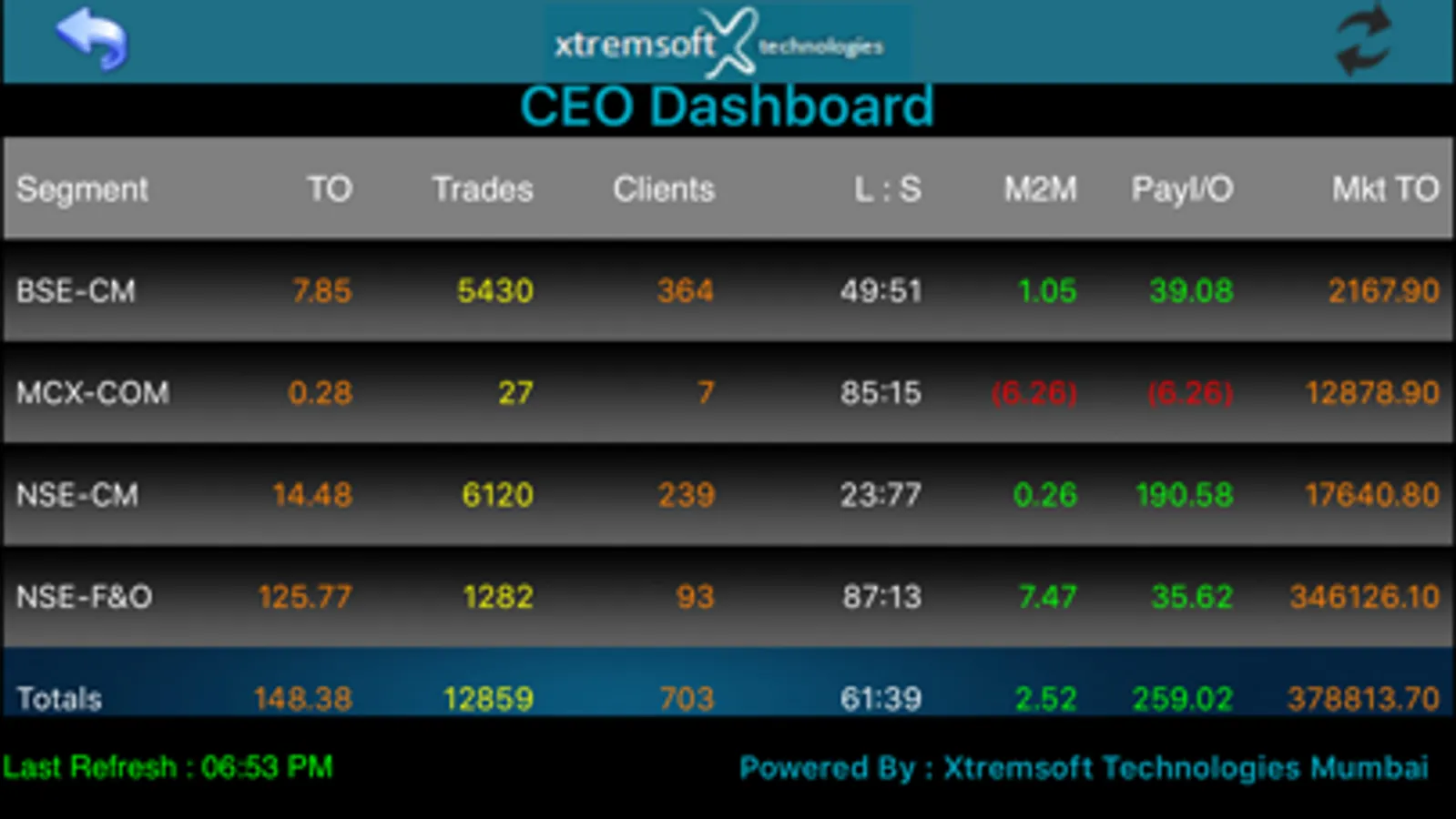 CEO Dash Board mobile app shows the overall Segment wise summary. Summary contains Turnover, No.of Trades, Total No.of Clients who has traded, Long and Short position's ratio, Value of M2M in Lacs, Payin/Payout amount in Lacs, Market's Turnover in Lacs.
