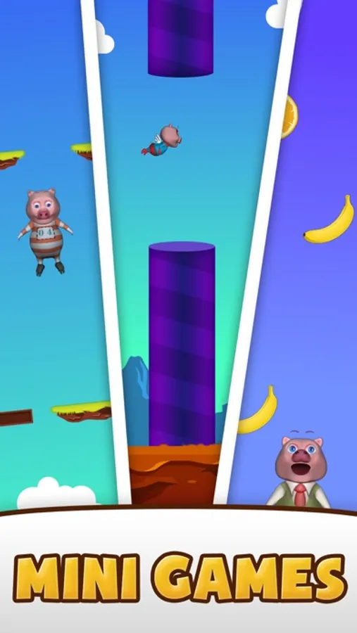 ▶ Play mini games with the piggy! Choose your favorite: Flappy Piggy, Food Drop, Piggy Hop, Piggy vs. Monkey, Spider Pig, or Tilt Jumper