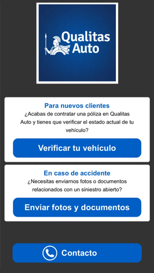 Permite la verificación del vehículo y el envío de fotografías y documentación en caso de accidente. Además, muestra los teléfonos de Qualitas Auto.