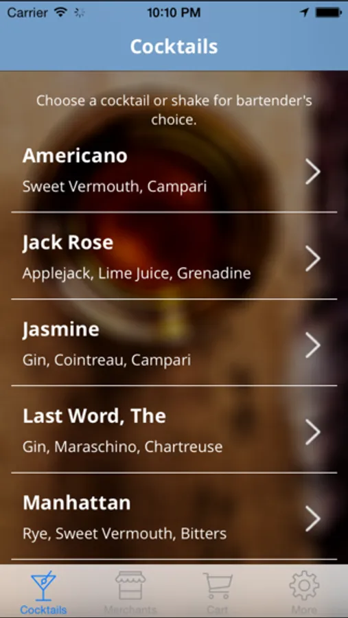 Bar Cart is a new way to discover great cocktails and easily order ingredients from local wine and liquor stores. Browse our expertly curated list of cocktails for inspiration, and easily add needed ingredients to your cart. Place an order to have the ingredients immediately delivered to your residence.