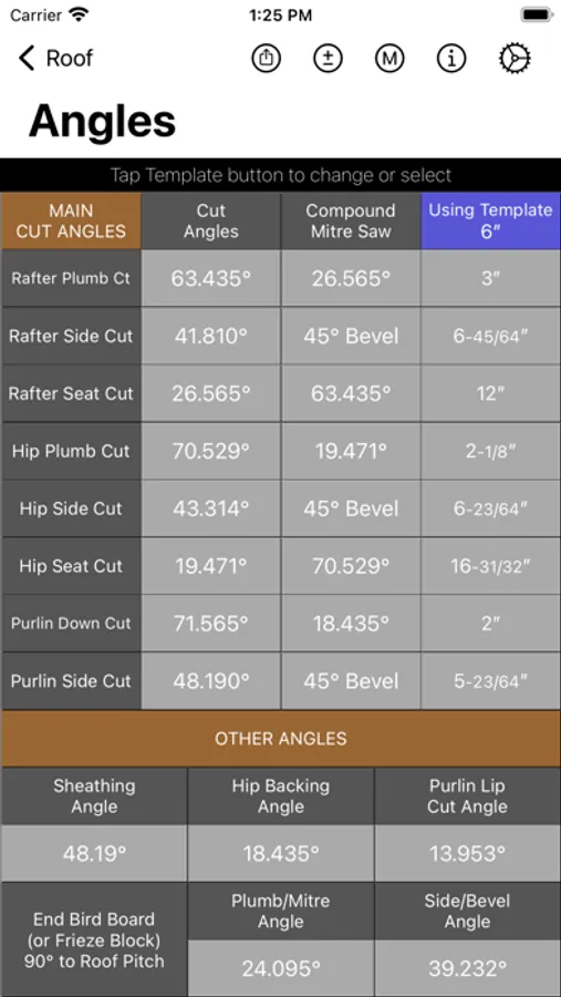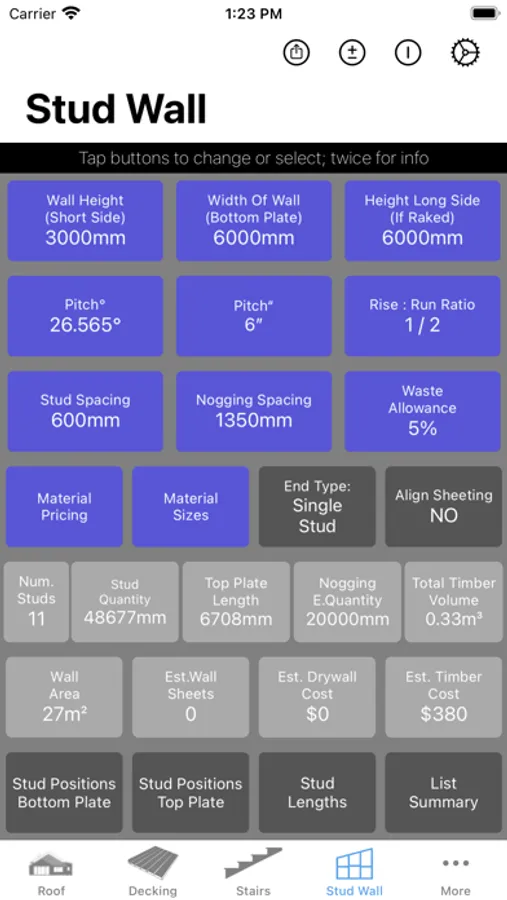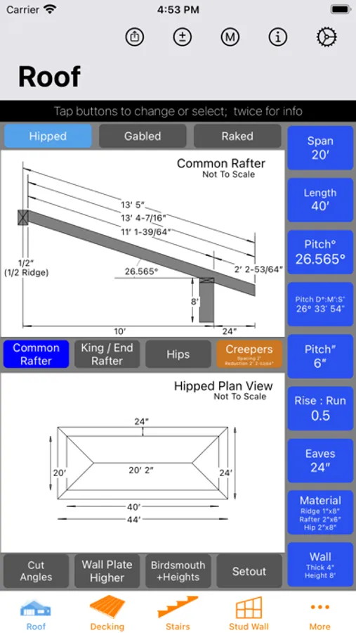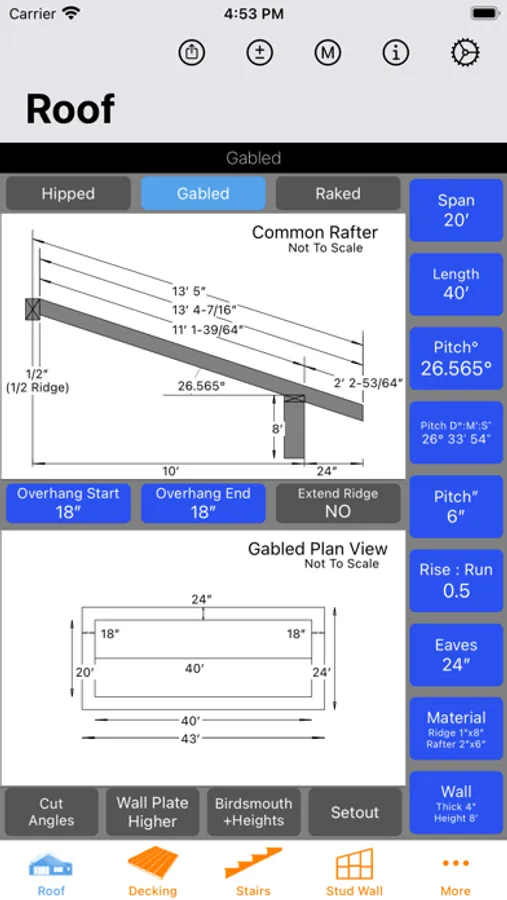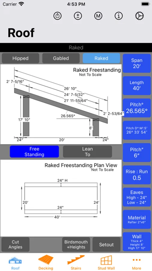 Roofing and framing carpentry calculator, decking, stairs, concrete, stud wall calculators.