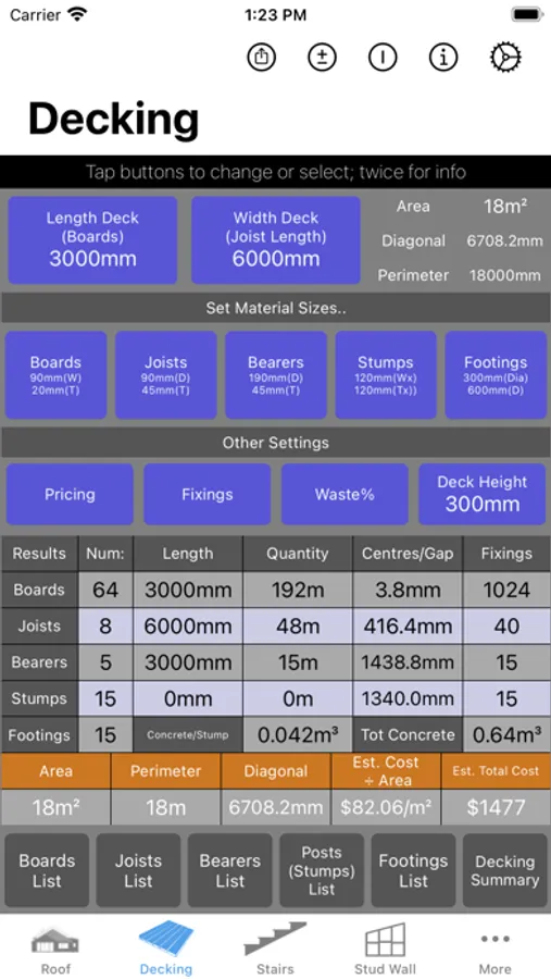 In additions to the roof calculators the decking / flooring, stud wall and concrete calculators also estimate quantities and costs.