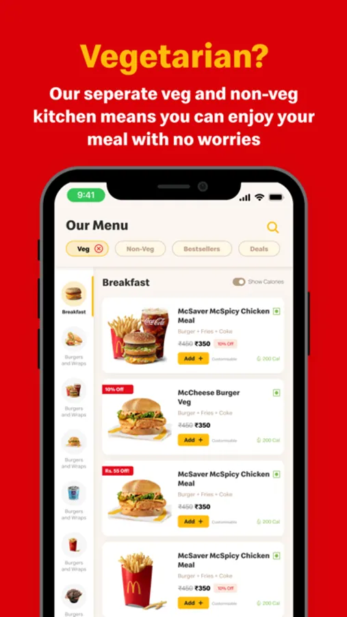 Placing orders from the McDelivery app is simple, safe, and convenient. Now your favourite McDonald’s items are just a few taps away. Be it McAloo Tikki, McChicken, Cappuccino, Fries, McNuggets, or anything else that is there on the menu list, just tap on the item, customise & add it to your cart, make the payment, and there you go. Indulge in your favourite McDonald’s food on any day you wish.
