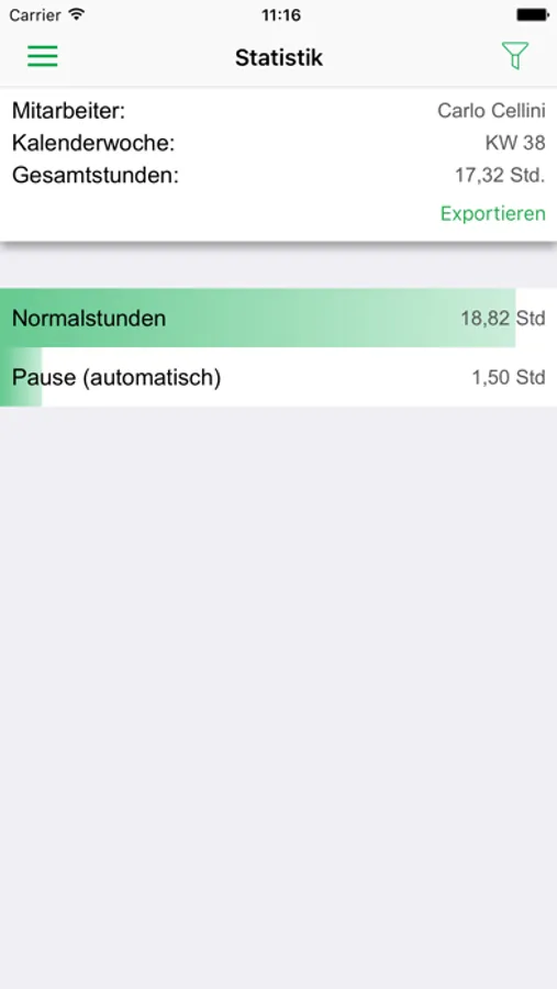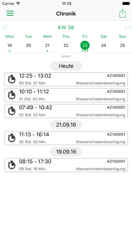 Die App startet und die Ansicht zeigt direkt die Stundenbuchung. Man erfasst Arbeitsbeginn, teilt Mitarbeiter ein und weist den entsprechenden Arbeitszettel zu. Die Stundenbuchung startet durch die Auswahl von Start oder bei Aktivierung der gesamten Buchungszeile. Die App unterstützt ebenfalls Kolonnenbuchung. Am Ende gibt man das Arbeitsende ein und schließt die Stundenerfassung ab. Der Clou ist die Nacherfassung. Stellt der Mitarbeiter am Abend fest, dass Stundenbuchungen fehlen, bucht er diese einfach nach.