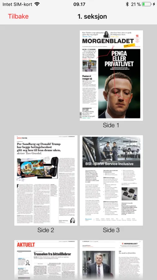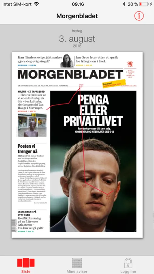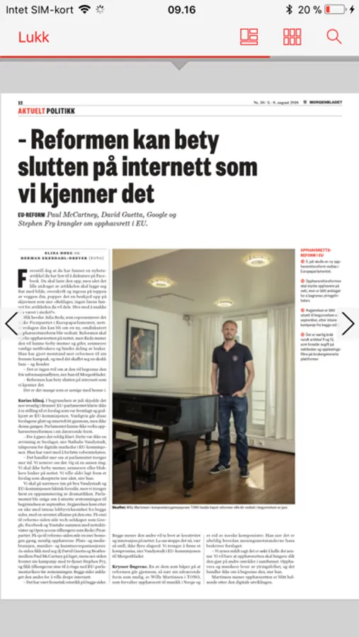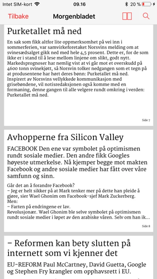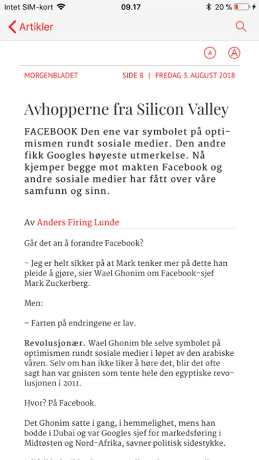 Artiklene kan zoomes inn og leses slik de ser ut i avisen. Du kan også trykke på enkeltartikler og få dem opp som ren tekst.