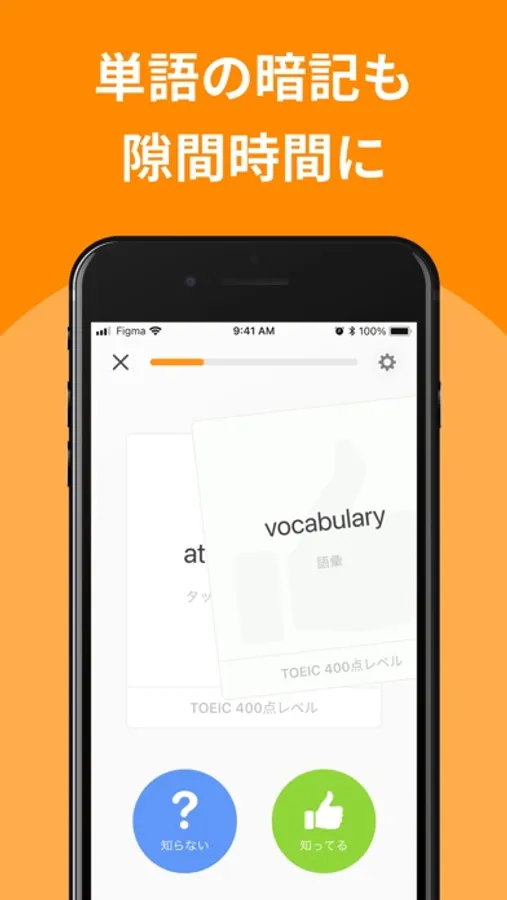 知っていたら右へ、知らなかったら左へカードをめくるだけで、知らない単語のみが繰り返し表示され、学習できるカードめくり。