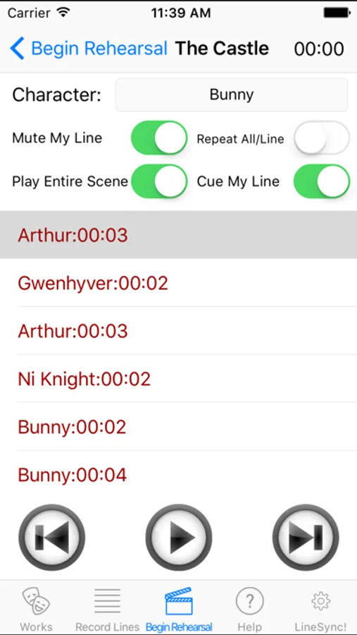 Once you are done recording the lines for the scene you wish to rehearse, tap on the rehearse icon and you are presented with the rehearse screen. From here you can choose to play through the entire scene, as well as mute/cue your line. To mute your line, simply select the character you will be playing by tapping the "down arrow", and then clicking the "Mute My Line" switch so that it shows green. The scene will play through and when it gets to your line, it will pause for the line length...giving you time to say it and wait for your next cue. The "Cue My Line" switch will cue the line for you by providing an audible "ding" immediately prior.