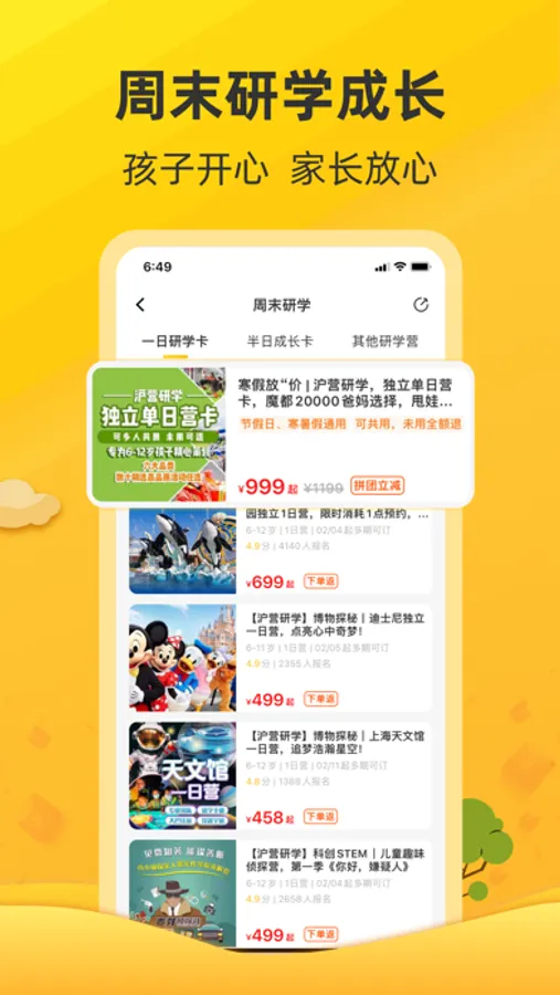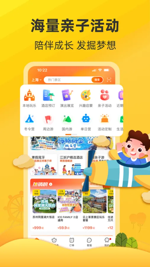迪士尼、海昌等亲子乐园特价,亲子餐厅、展览、儿童剧门票;亲子酒店、自助餐特价;户外运动、科普活动、教育培训;冬夏令营、国内外亲子旅游游学,应有尽有!