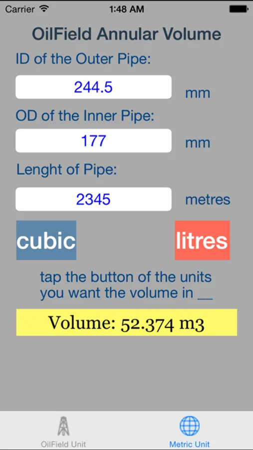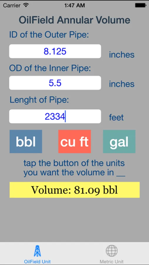 Oilfield Annular Volume Pro is made for the oilfield personnel but it can be used by anyone who needs to calculate the annular volume between two pipes or hole and pipe. Choose the type of units with the tab at the bottom (OilField Unit or Metric Unit). Input your inside diameter (ID) of the larger pipe or hole, the outside diameter (OD) of the smaller pipe and the height or depth. Then choose the units that you need the volume in (cubic feet, barrels or gallons for US and cubic metres or litres for Metric) and the app will calculate the volume for you.