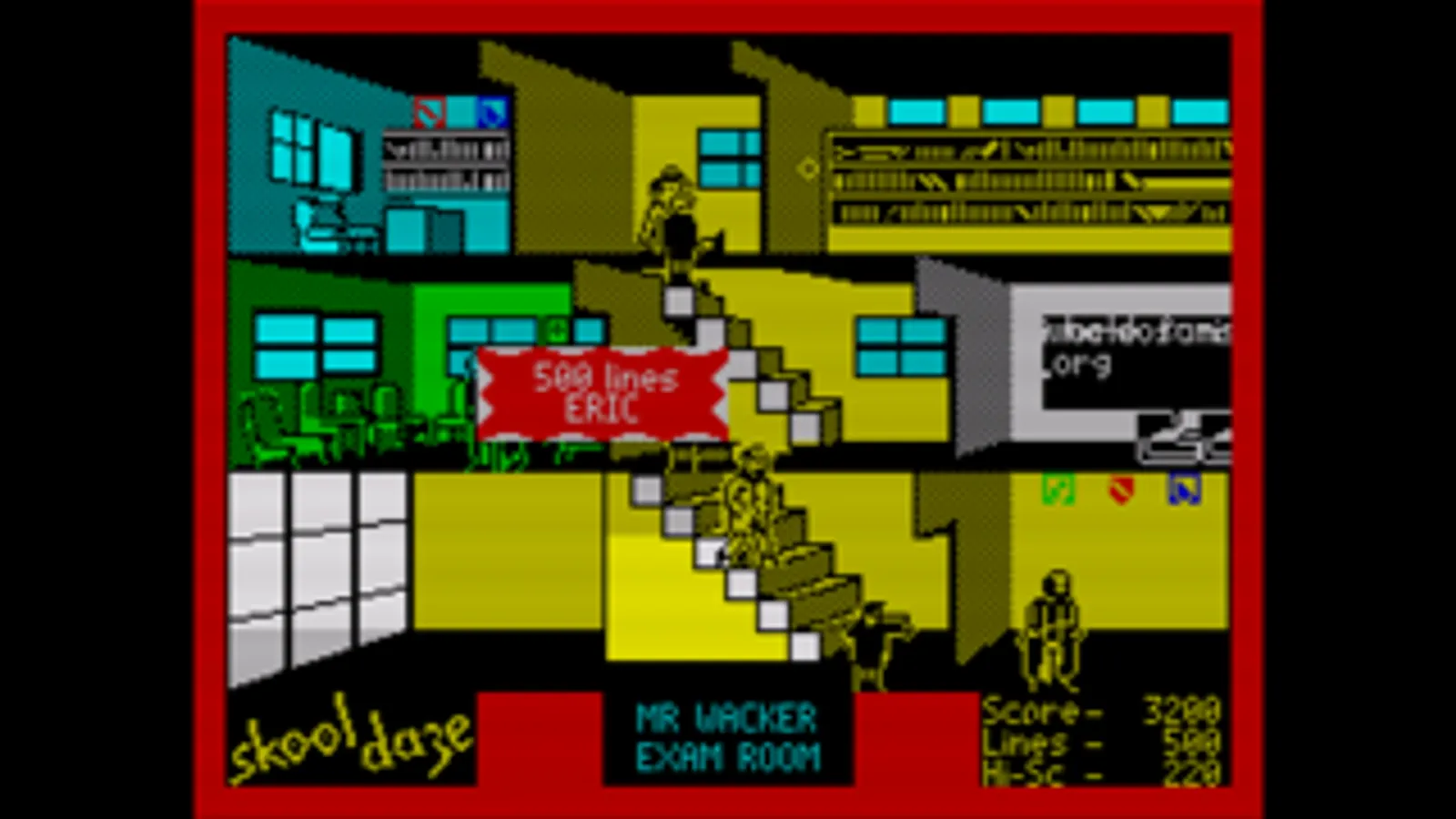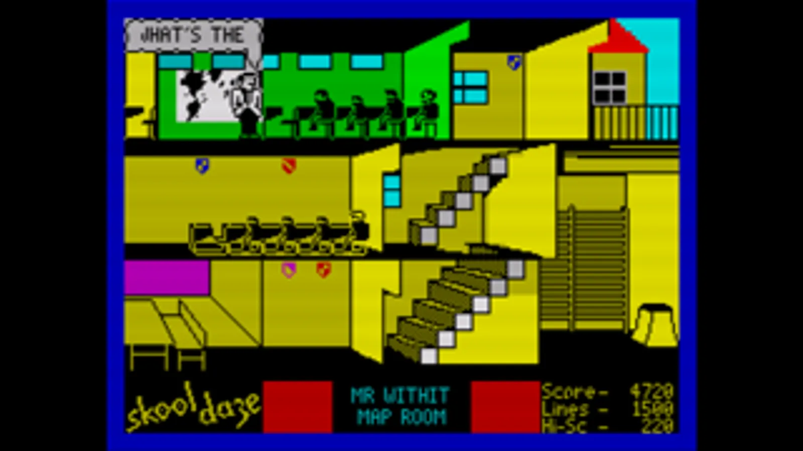 Skool Daze - the game that has everything - excitement, drama, comedy, tragedy, catapults... join our hero on a madcap romp with your favourite characters - the wicked headmaster, the nutty professor, the ancient history master (the history's quite old, tool!) and, not forgetting the swot and the school bully.