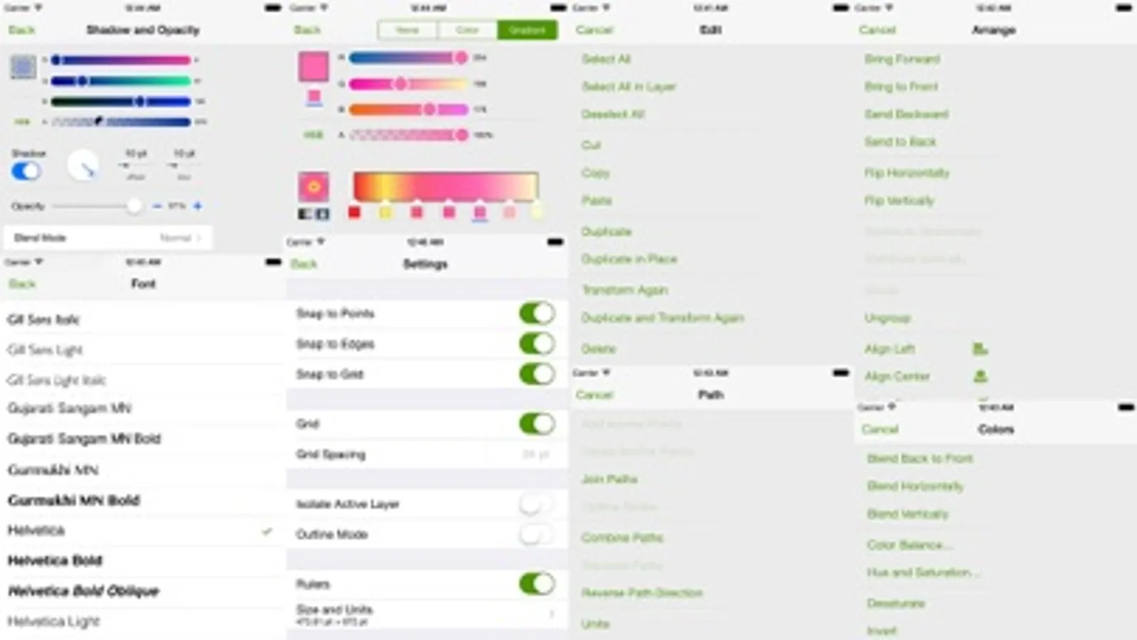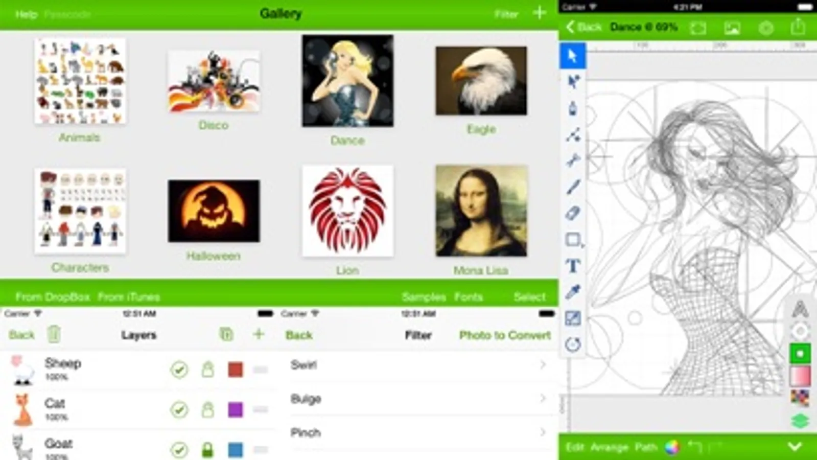 Vector Touch is your Ultimate Vector Illustration App for your iPhone, iPod Touch, and iPad. It supports Paths, Compound Paths, Text, Images, Groups, Masks, Gradient Fills, and an unlimited number of Layers. It was designed with performance in mind. It can easily handle Drawings with hundreds to thousands of shapes without bogging down. Export/Import your Drawings directly to/from your Dropbox, PC, MAC, and Send/Receive them Device-to-Device directly via AirDrop.