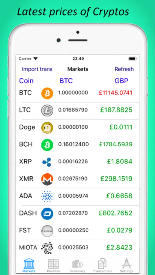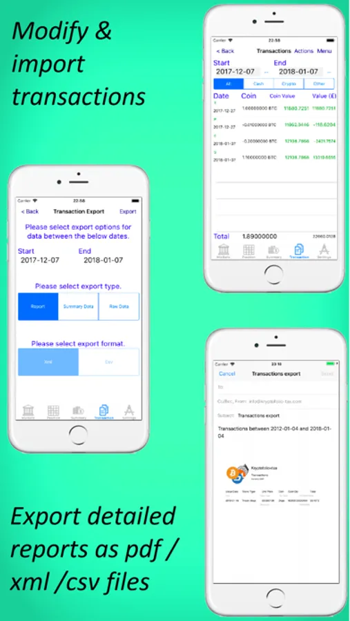 All major crypto currencies are supported as well as six custom user defined ones. Kryptofolio+tax can export report data in a variety of different formats either pdf reports, or CSV / XAML for subsequent import and analysis with other tools.