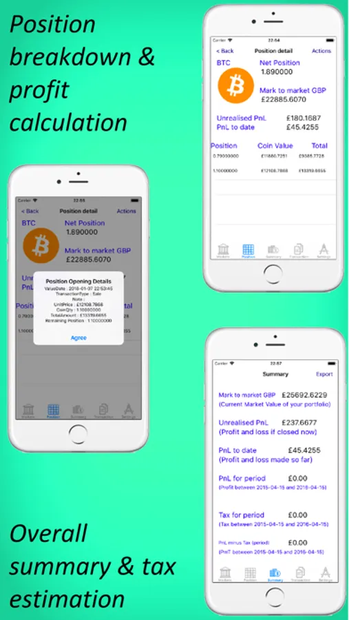 Kryptofolio+tax allows you to import all your transactions from your Bitcoin and Altcoin wallets either via a wallet export to csv or direct from the blockchain or (for extra privacy) a QR Code direct into your smartphone; it will then automatically lookup the historical value of these transactions in your selected fiat currency (USD,GBP,EUR,any other). The tool can then calculate profit and loss for each transaction and keep a running score.