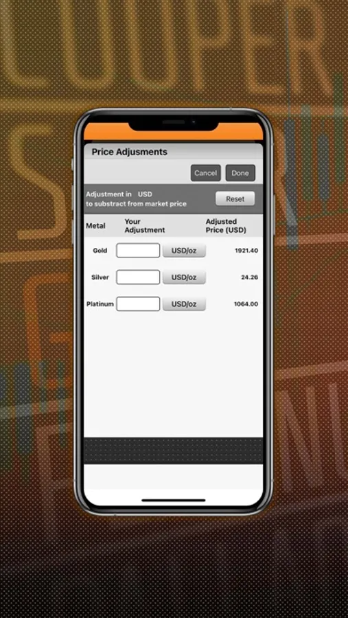 Customize your calculation options with fully editable product purities and descriptions. Make quick and easy live price adjustments for gold, silver and platinum. Enter any percent of market value.