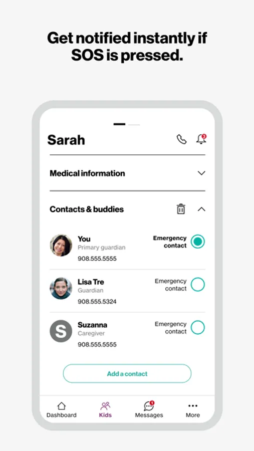 - Assign a contact to receive an instant notification if the SOS button is pressed.