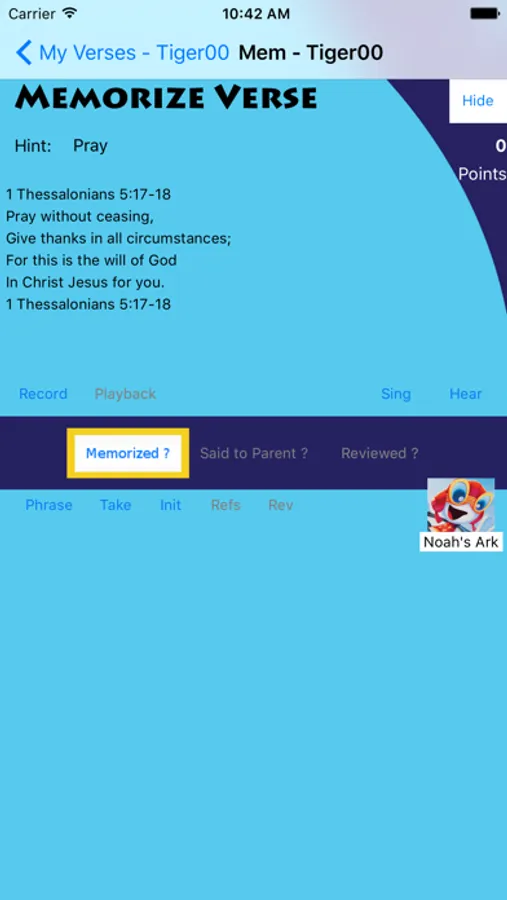Parents and children will love memorizing verses in this Bible memory app that coordinates with the Awana Sparks WingRunner program. Includes all the Awana songs. Kids love the audio recording capability. Children can see, hear, record, sing and say verses and play several games to help them commit verses to memory. Tracks memory and review status for multiple participants and gives points for their memory/review activity. As reward, participants pick animals to "help Noah load the ark" and hear the animal sounds. Shares memory status information across multiple devices via iCloud so parents can immediately see their Sparky’s progress.