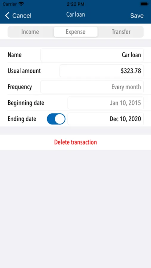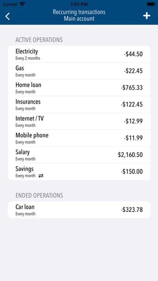 Easily create recurring transactions (salary, rents, insurances...) with various periods (days, weeks, months...). The amount can be adjusted at each occurrence.
