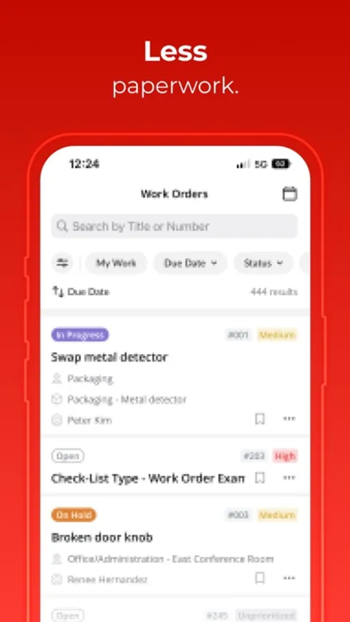 · View and organize your work orders by due date, most recently updated, status, priority, location, and more