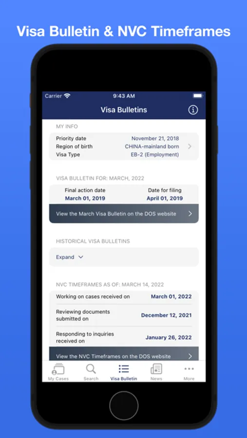 The ultimate app for tracking USCIS and NVC immigration cases for U.S.A visa and citizenship. Quick access to Visa Bulletins, the latest immigration news and push notifications keep you up to date.