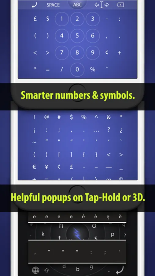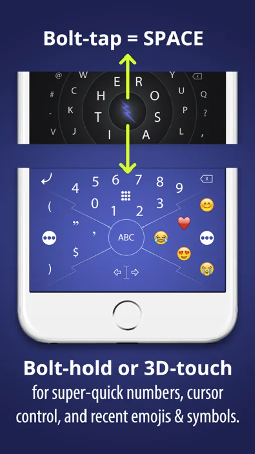 - HOLD or 3D-Touch the Bolt for super-quick access to numbers, cursor control, and your recent emojis and symbols.