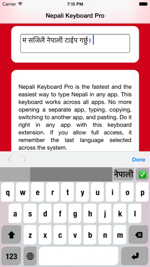 Fastest and the easiest way to type Nepali in any app. This keyboard works across all apps. No more opening a separate app, typing, copying, switching to another app, and pasting. Do it right in any app with this keyboard extension.
