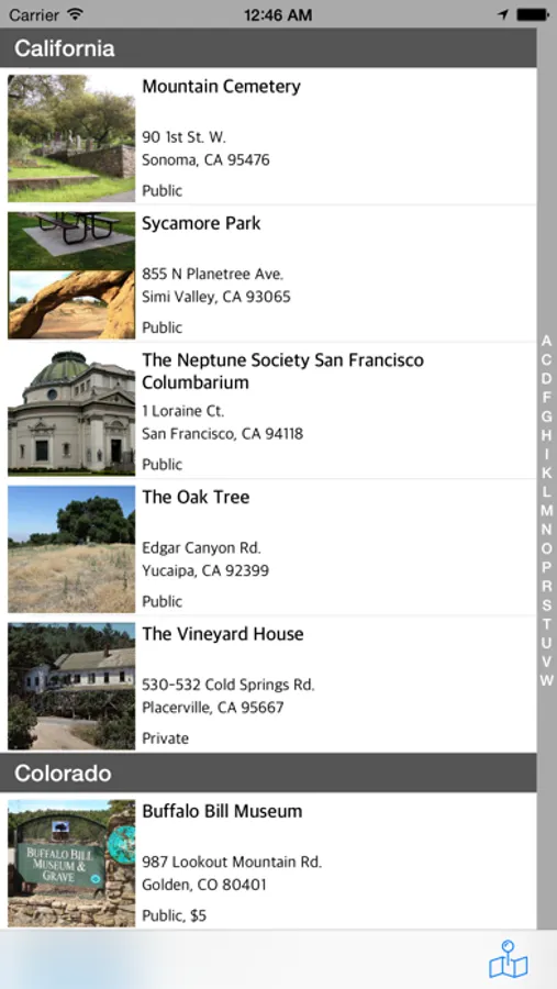 * Provides information as to whether the location on open to the public for visitation, and cost to get in (if known)