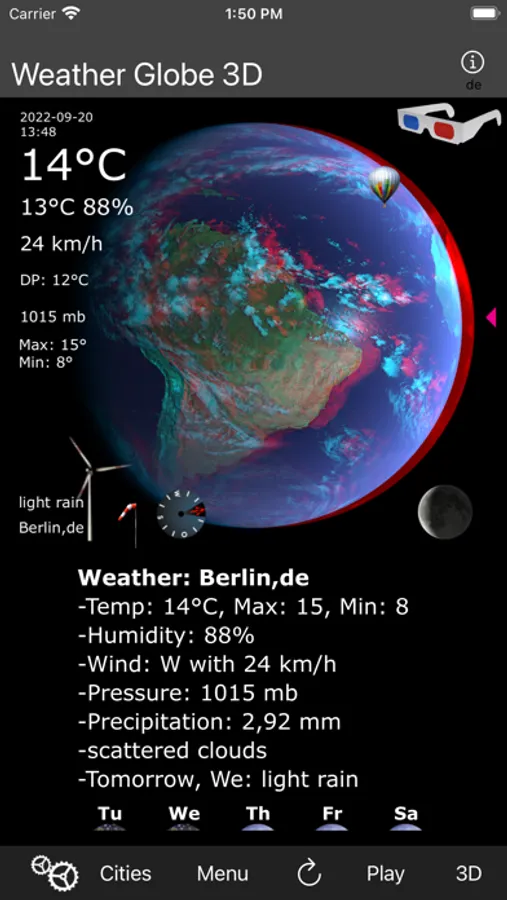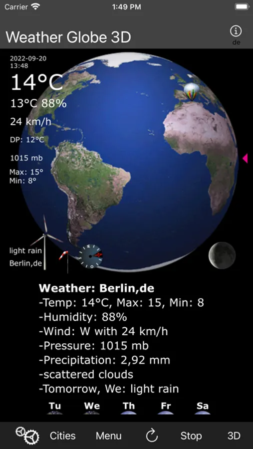 Use your iPhone, iPod Touch or iPad as a real weather station. Large temperature display, perceived temperature, humidity, wind speed, wind direction, barometer, moon phase display and other values leave nothing to be desired. With this app you will have fun with the weather. You can save 6 cities and get very accurate weather. A 4-day preview is integrated.