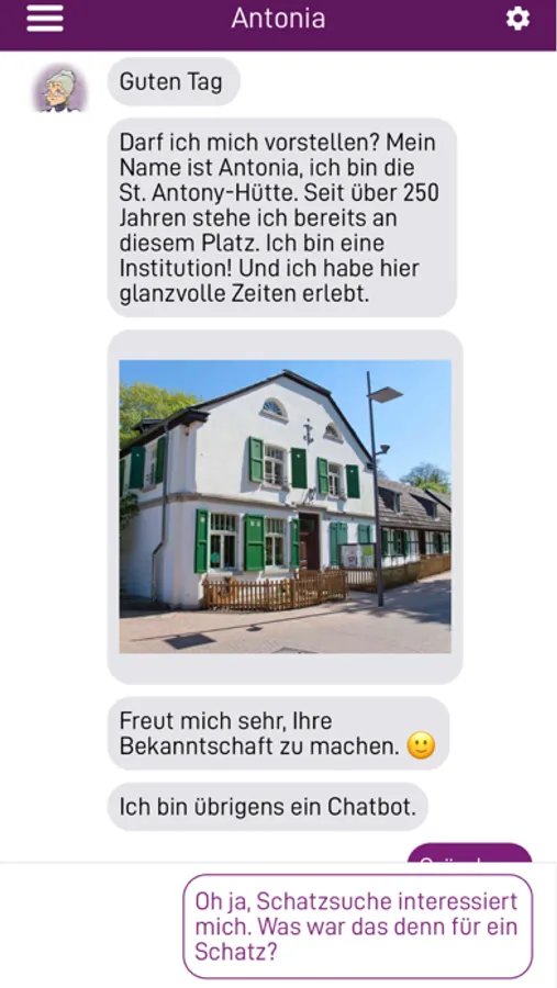 Lernen Sie die St. Antony-Hütte kennen. 1758 gegründet ist sie die älteste Eisenhütte der Region. Heute sind hier das LVR-Industriemuseum und der erste Industriearchäologisch Park Deutschlands zu finden. Als Begleitung stehen Ihnen zwei illustre Persönlichkeiten zur Verfügung: Hüttendirektor Gottlob Jacobi führt Sie in Augmented Reality Szenen in die spannende Firmen- und Produktionsgeschichte der St. Antony-Hütte ein. Oder plaudern Sie mit Antonia in einem amüsanten, textbasierten Chat über die großen und kleinen Geschehnisse rund um die Wiege der Ruhrindustrie. Das können Sie sogar vom heimischen Sofa aus.