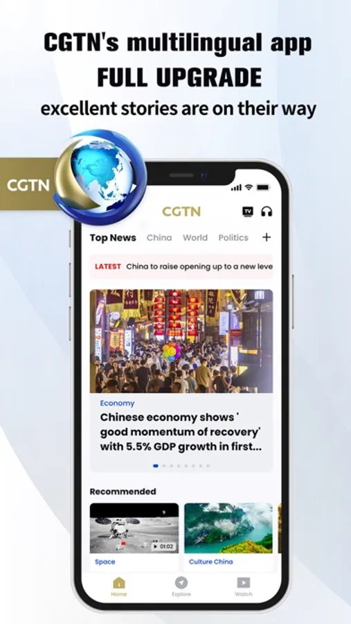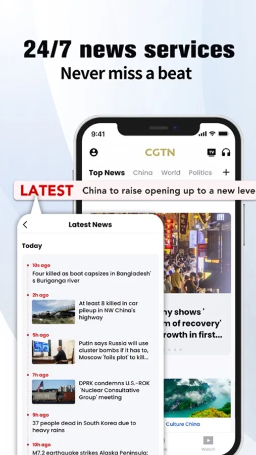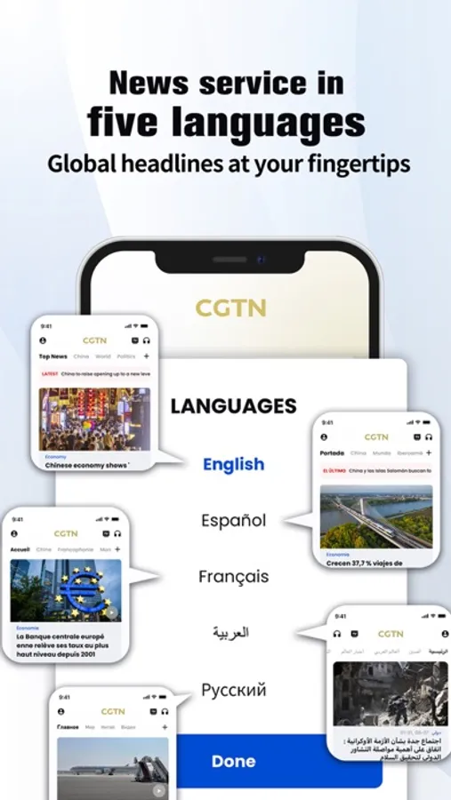 The latest version of the CGTN app supports five languages: English, Spanish, French, Arabic and Russian. It features a wide array of original content, including breaking news, in-depth stories and livestreams. The app also hosts a comprehensive archive of original articles, audio, video, and TV shows covering topics across politics, business, technology, science, sports, nature, culture and others. It gives you access to all the trusted information you need on the go.