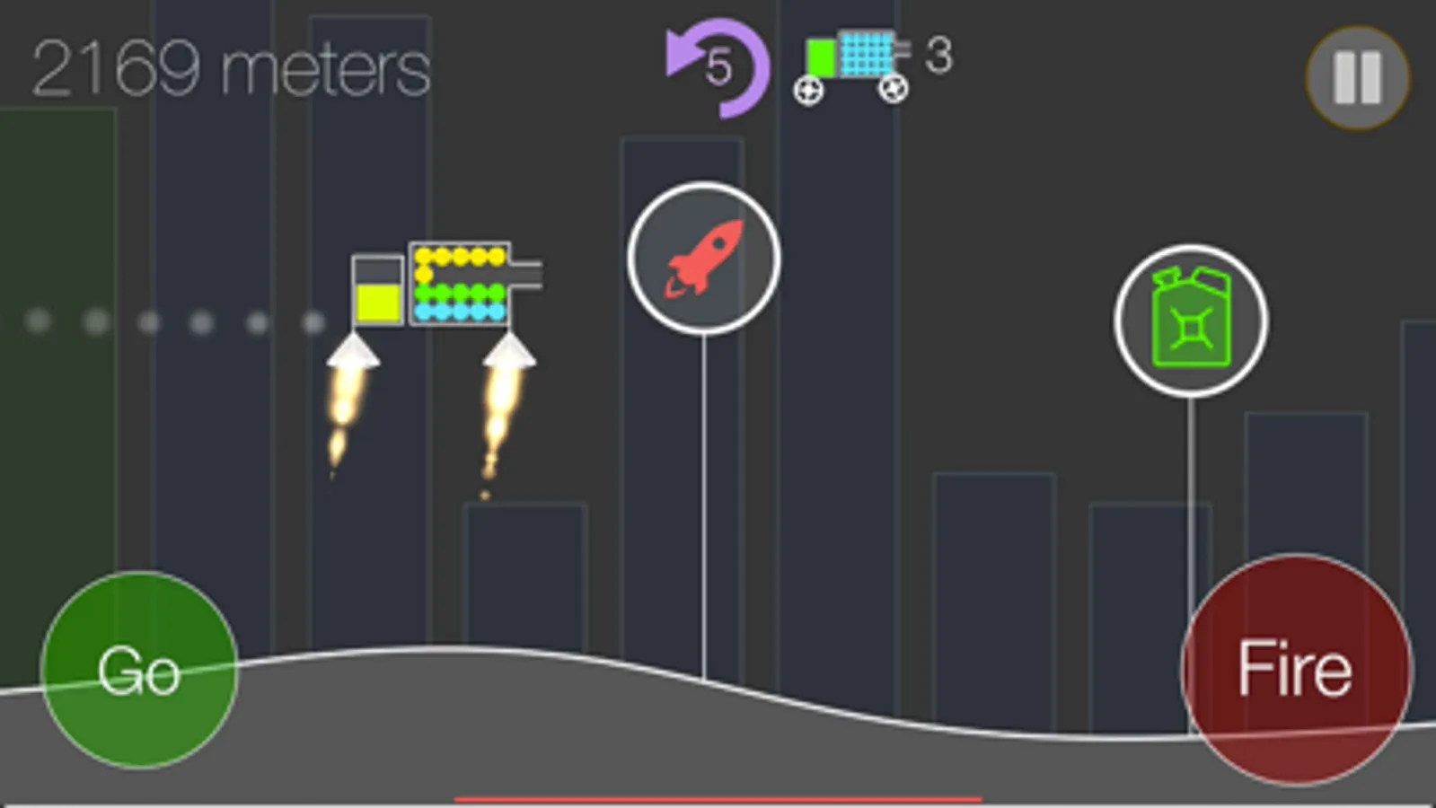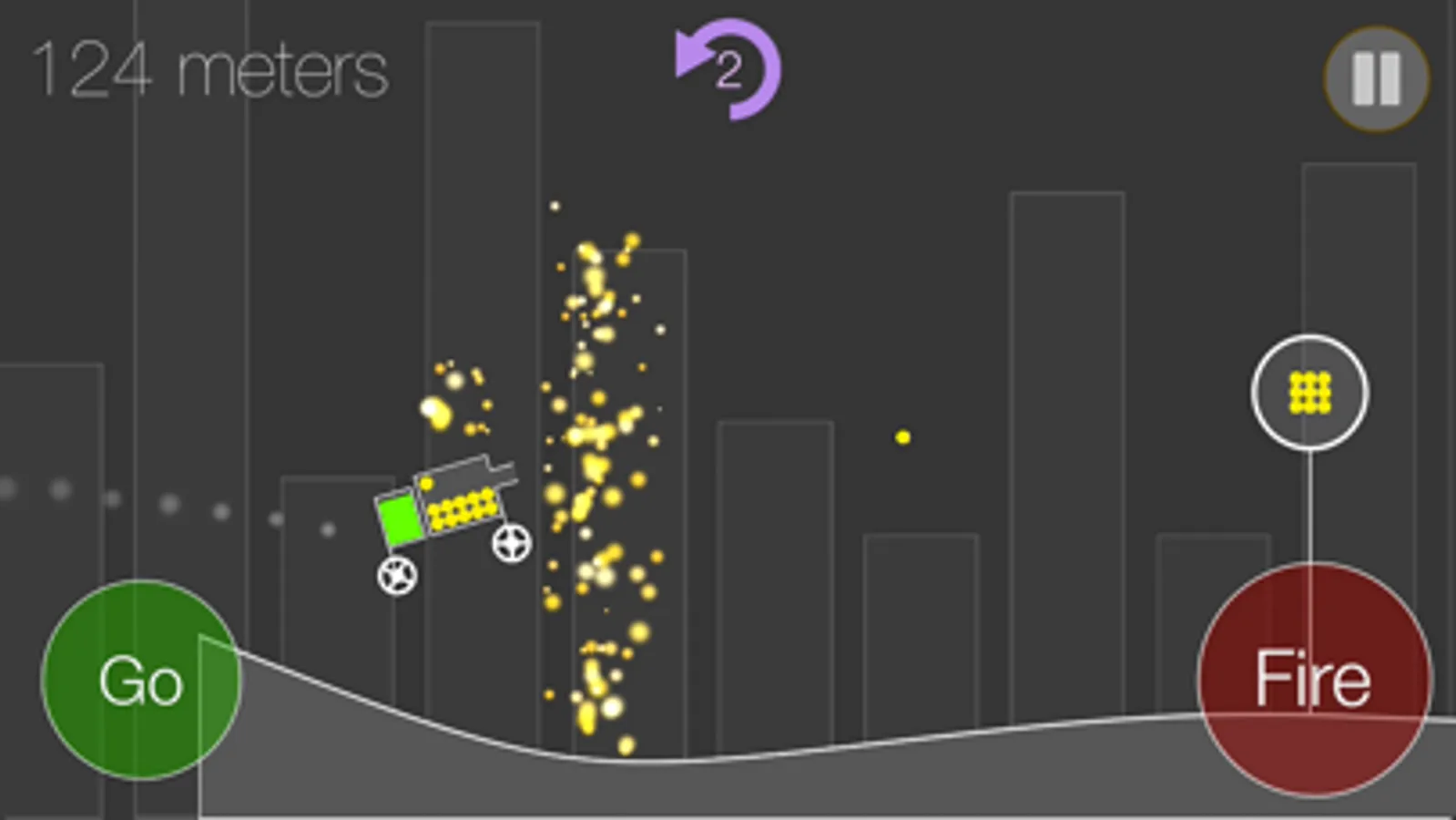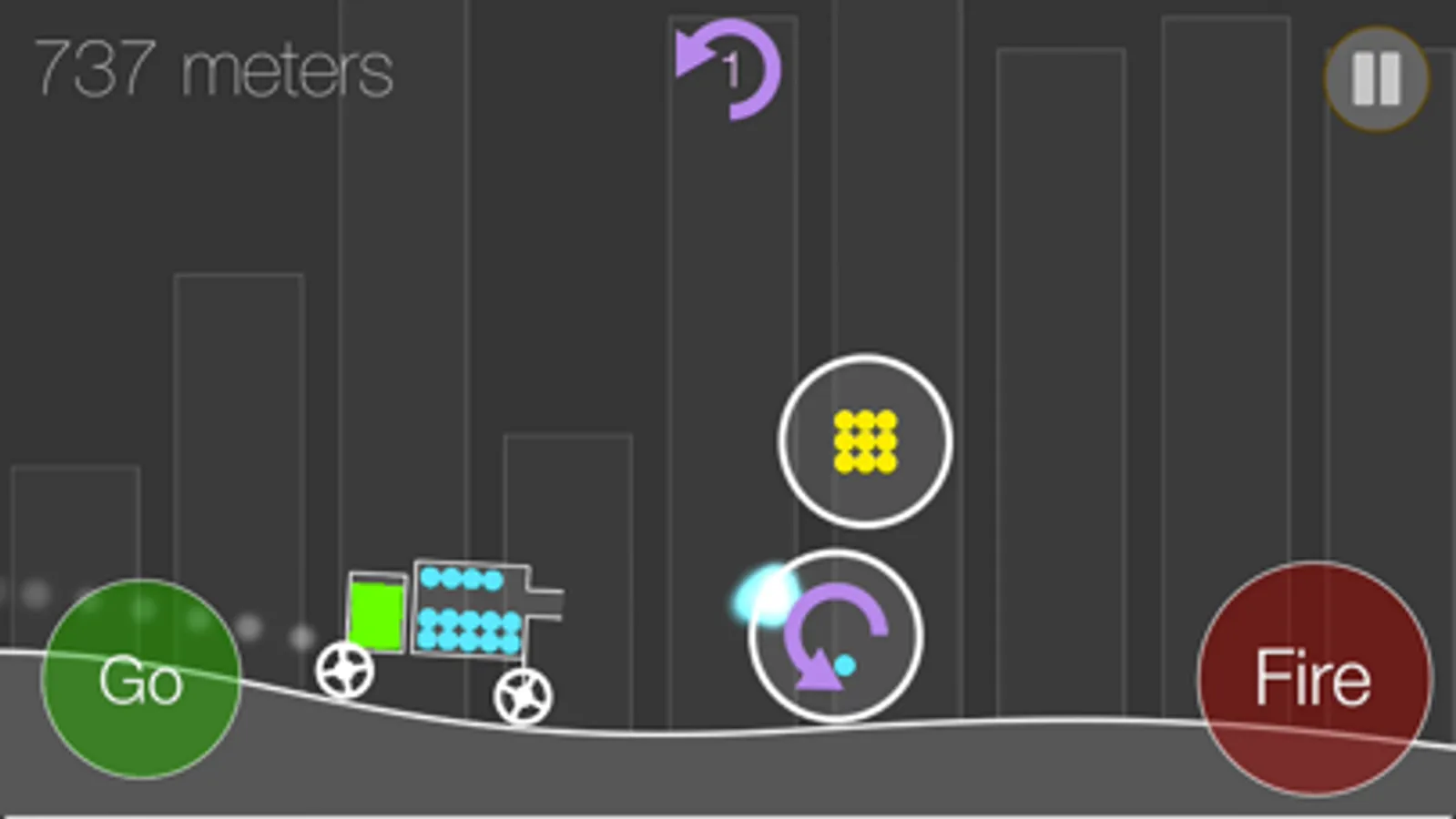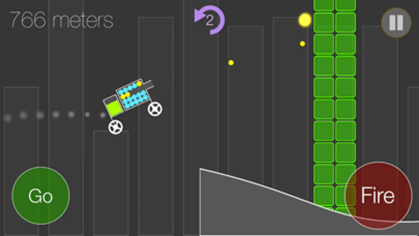 Drive a simplistic car with bullet balls as far as possible. Jump over the pits, explode walls and shoot bonus holders. Collect fuel, bullet balls and other bonuses which will help you to go further. The game is very dynamic and fast. Each ride will end when car falls into the pit, fuel tank is empty, no bullets or car is overturned. Far distances will reward player with the stars.