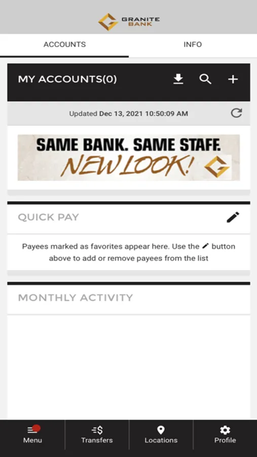 Carry your bank with you at all times with Granite Bank’s mobile application! Users can deposit checks from their mobile device, view account balances, transfer money between Granite Bank accounts, and locate the nearest available ATM. Secure, fast, and easy to navigate, the Granite Bank app enables market-leading bank technology with access to the personal touch of a community bank.