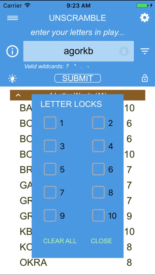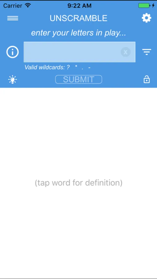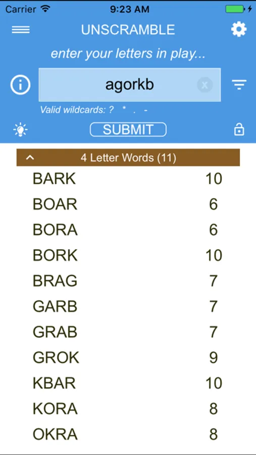 Input letters and find all playable words and values. Always find the highest scoring word for SCRABBLE® and Words With Friends. This SCRABBLE® cheat ability is nice but we prefer to let your partner know you are using a word unscrambler to unscramble letters. Some call it word breaking or using a word breaker. Use filters for 'Starts with' or 'Ends With' and many other filters to speed up word searching. Select from multiple dictionaries. Increase your vocabulary by finding words and looking up the definition by tapping the word. You will see how easy generating words is. Most of all, have fun!