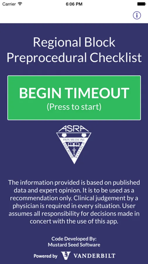 The ASRA TIMEOUT app provides a quick and easy way to execute a pre-procedure timeout. Timeouts have repeatedly been shown to reduce human error prior to performing complex tasks. In regional anesthesia, it is imperative that we perform the correct block on the correct limb for the correct patient every time.