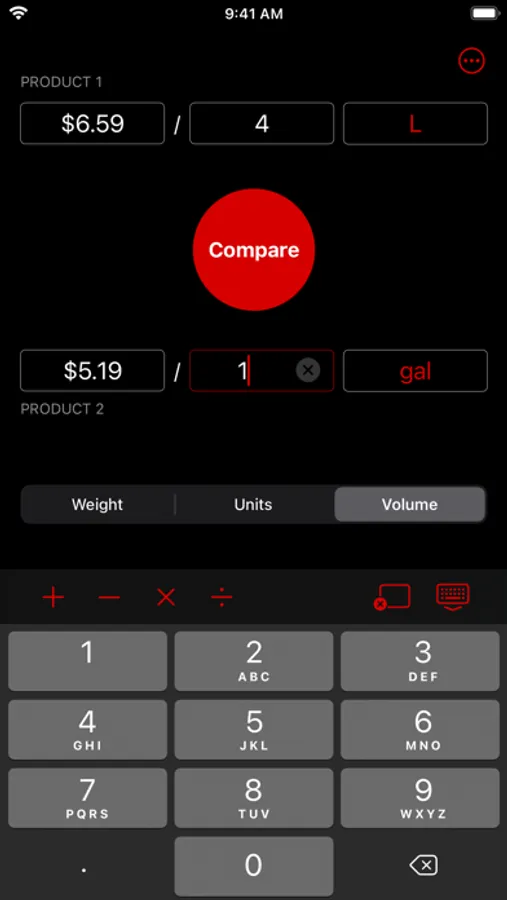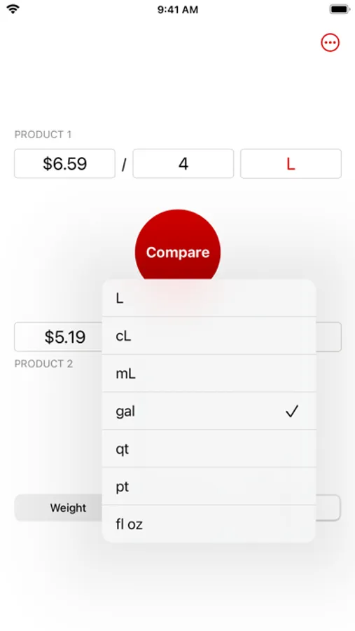 It's the easiest, fastest way to compare price per unit. Just enter the price and quantity for each option, then tap the Compare button to find out which one costs less per unit.