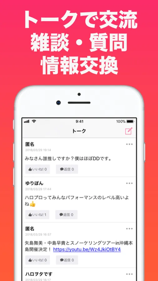 ハロプロファン同士でトークをして交流することができます。