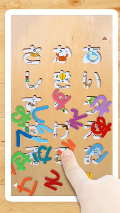 The background of the wooden frame shows an illustration of an object beginning with the letter of the Hiragana being displayed, so that children can think about the object straight away. As they touch and insert pieces in the frame, they will hear a native speaker say the words out loud. This allows them to listen to Japanese words with the correct pronunciation. By repeatedly touching the screen, they can play and learn spontaneously about the shapes of the letters and pronunciation.