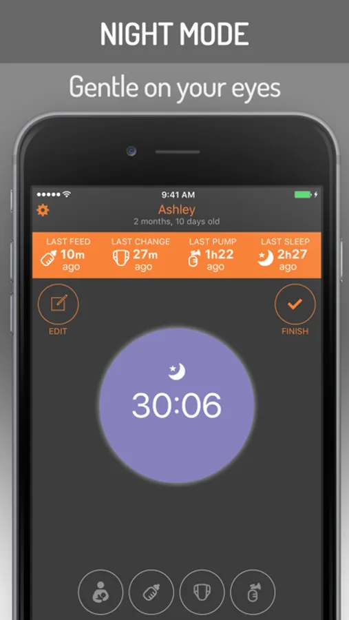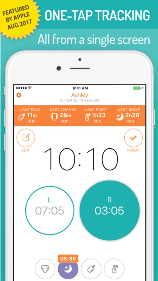 Track Nursing, Bottle Feeds, Pumping, Sleep and Diapers from a single tracking screen.