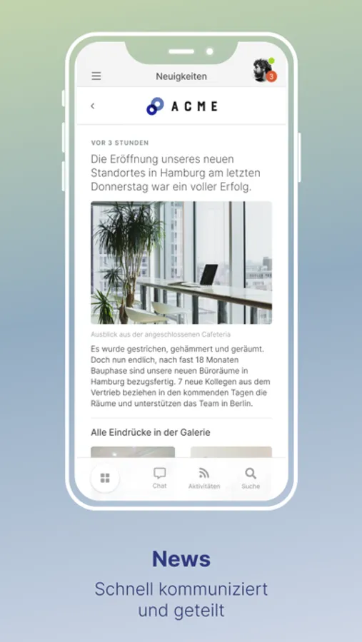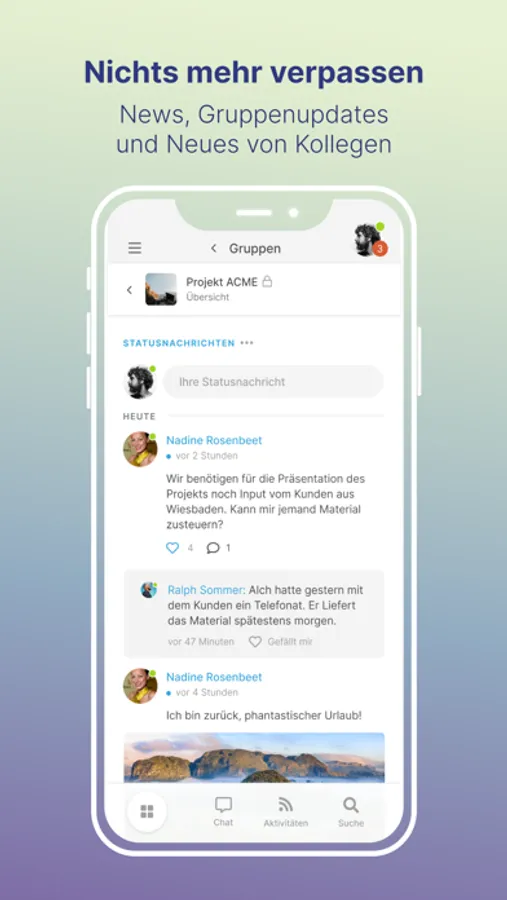 * Direkte Benachrichtigung via Push über neue Ereignisse und Aktivitäten (z.B. neue Kommentare, neue Aufgaben, Änderungen an Dokumenten denen Sie folgen,...)