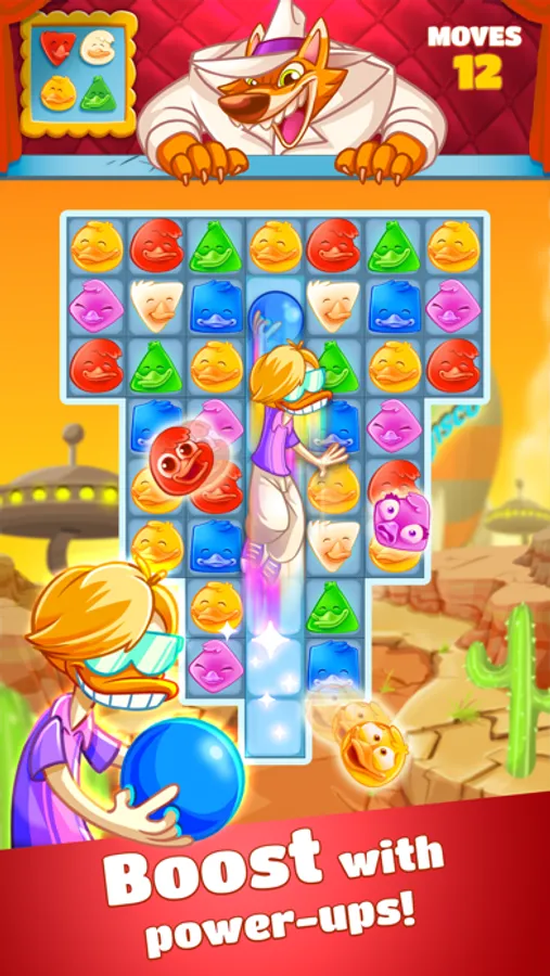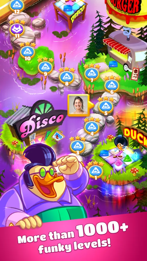 Lead Duck Travolta, Ducky Parton and Quackson Five through a world where ducks rule the dance floors and the 70's never ended! Use colorful combos, gather groovy powerups and build your Mojo to defeat wicked villains as you connect, dance and explore!