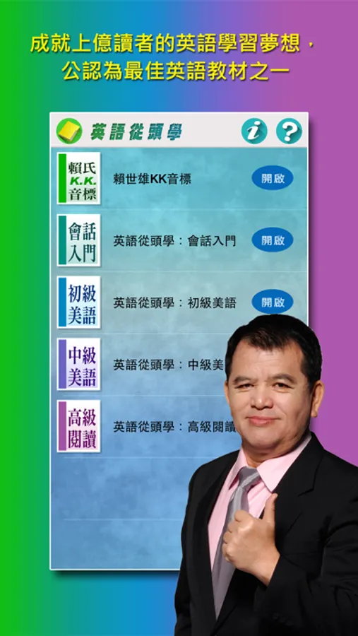 本系列套書App融合了賴老師學好英文的三態度與三階段之設計,適合學齡前~99歲閱讀,是賴老師早年自修學習英文所走過的路程;希望藉由此套書能真正幫助英文底子不好的人靠著自修,一步步重新把英文學好。