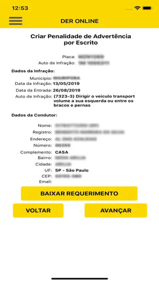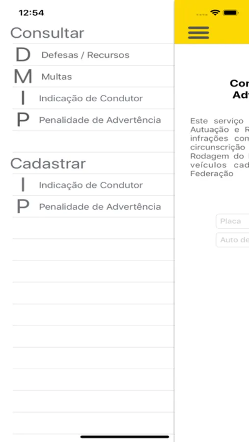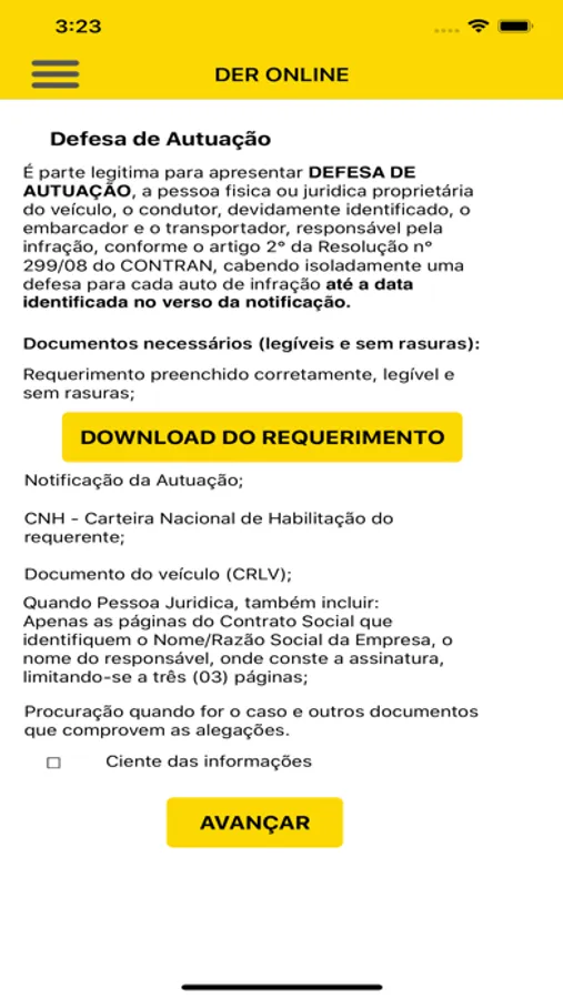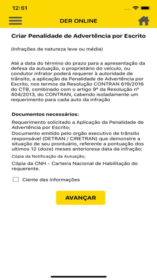 O Novo Aplicativo do DER disponibiliza aos usuários consultar Processos de Penalidade de Advertência por Escrito, Defesa da Autuação e Recurso Administrativo.