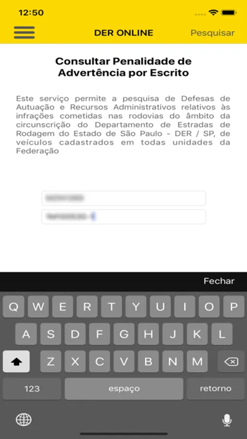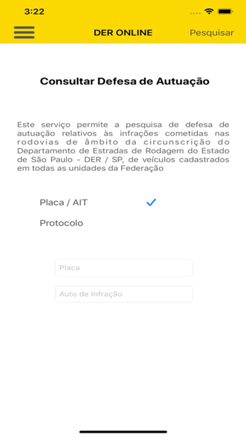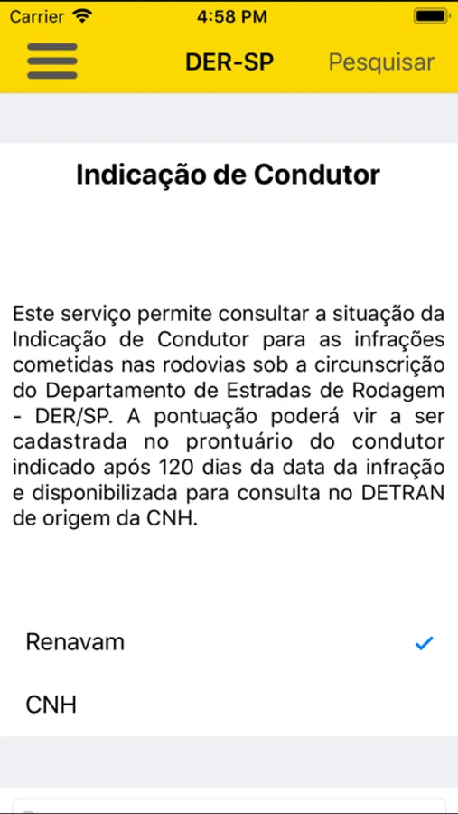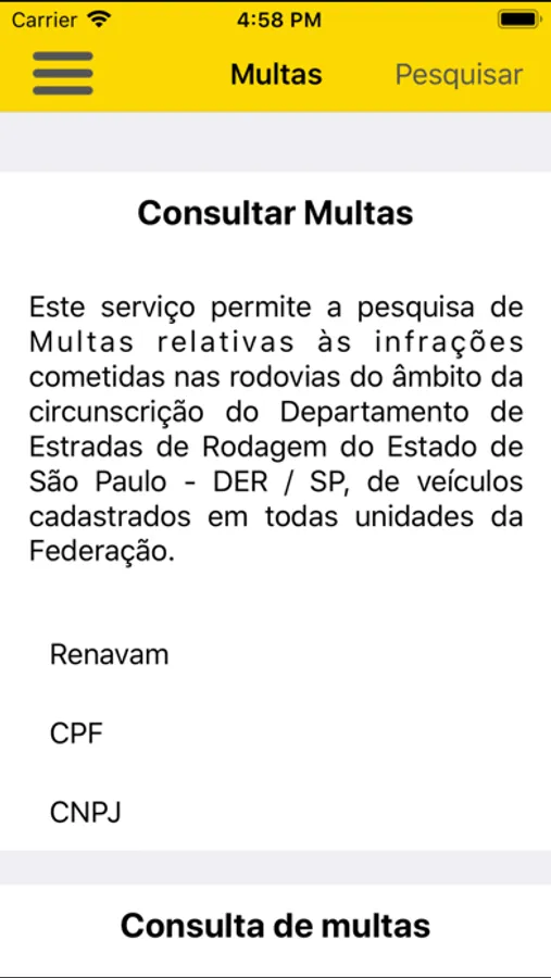 Permite também consultar Multas relativas às infrações cometidas no âmbito da circunscrição do Departamento de Estradas de Rodagem - DER.