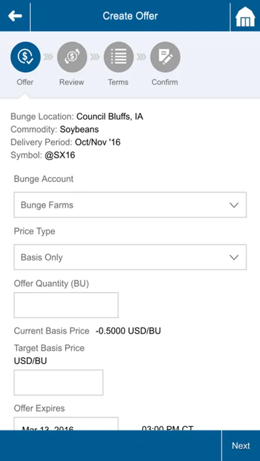 - Create an offer in a few easy steps and let Bunge watch the market for you.