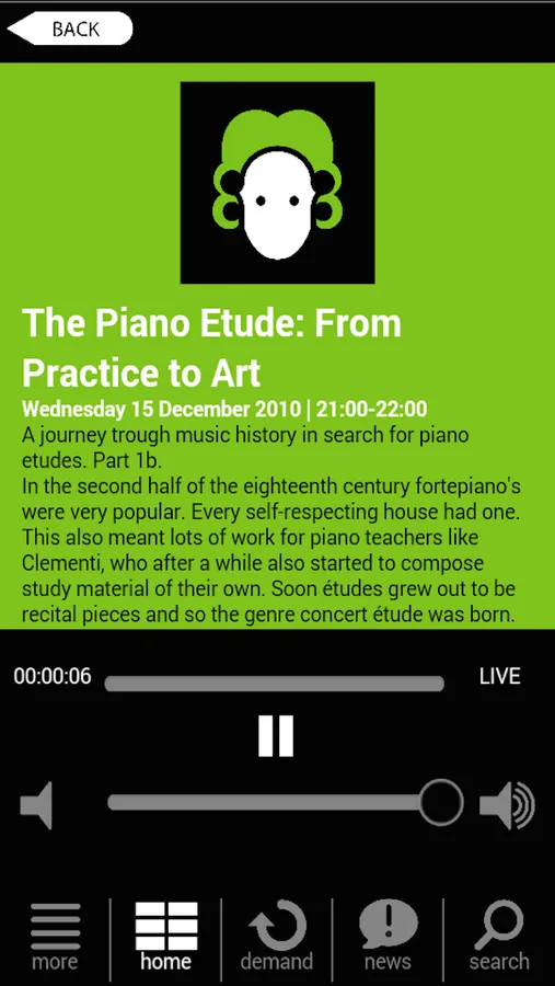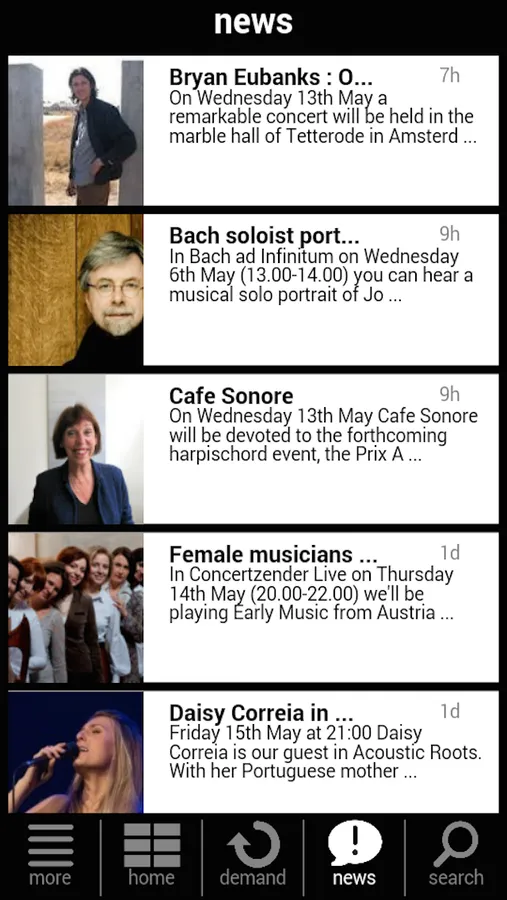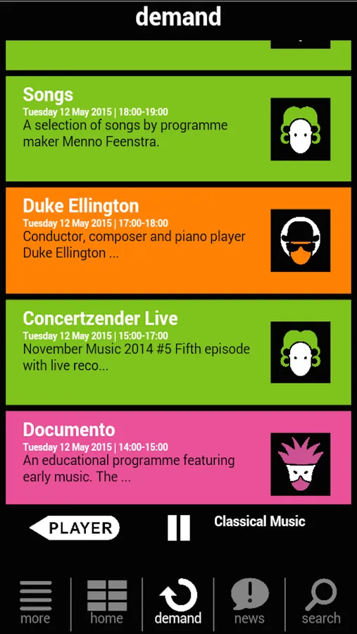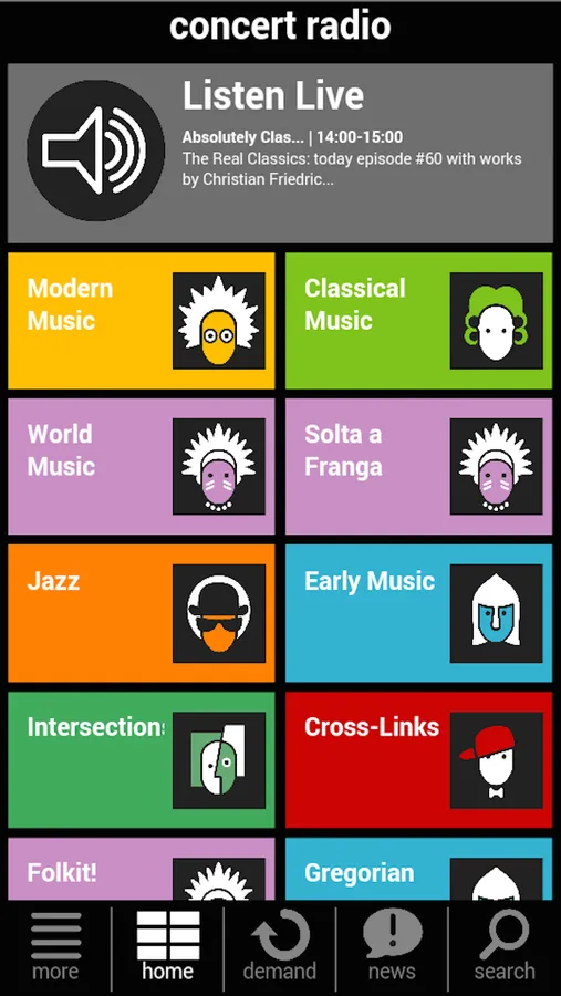 The Concertzender stands for exceptional, serious music. All pieces are broadcast as a whole (no highlights or excerpts) and our programmes are never interrupted by commercials. The announcements are kept brief, so that as much quality music as possible can be played. The broadcasts consist of a wide variety of surprising programmes, 24 hours a day, using a weekly format.