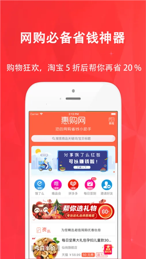 惠购网,一个专注于网购省钱的APP,提供淘宝优惠券返利、京东领券返利、拼多多领卷反利服务,从 2011 年上线至今已稳定运营 8 年多、服务百万用户,是公认的网购省钱利器。