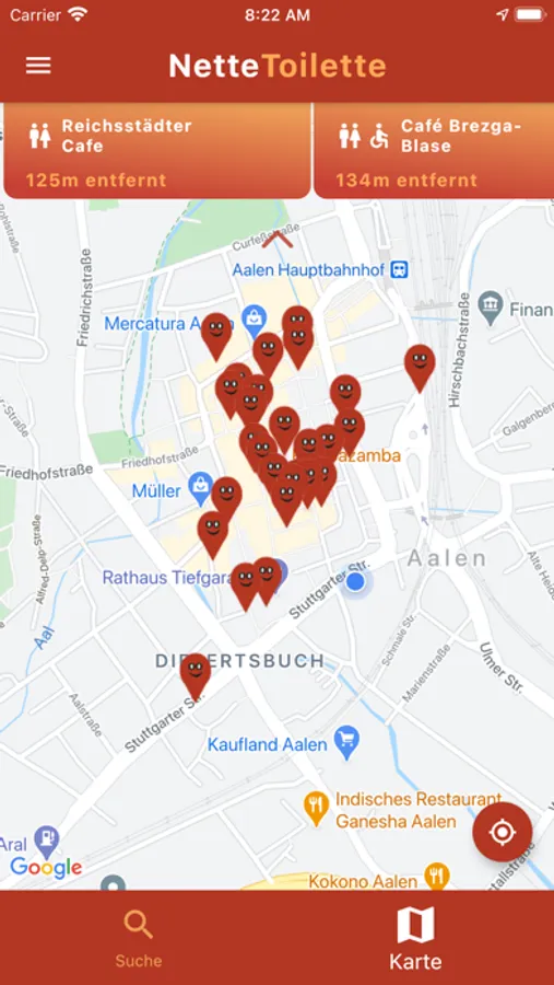 - Navigation (Fußweg) von Ihrem Standort zur nächsten Nette Toilette.