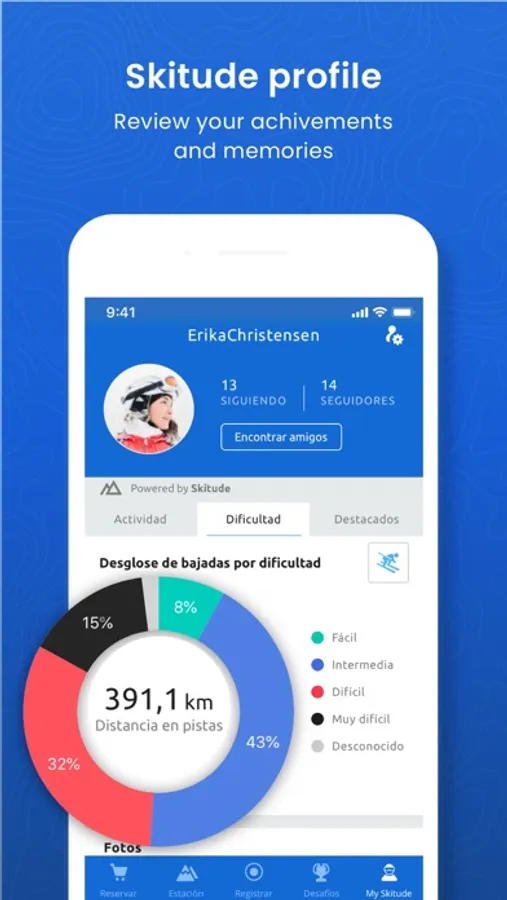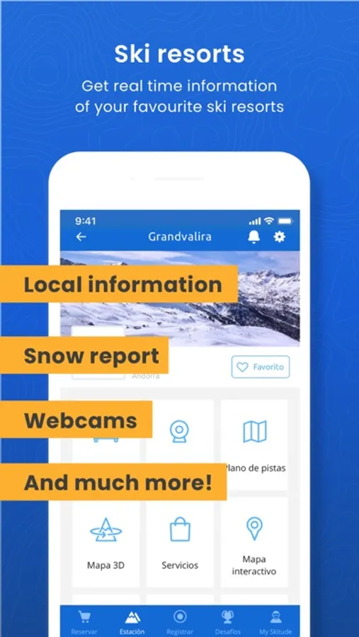 Check the conditions of ski resorts in the Alps, Andorra, the Pyrenees and in Sierra Nevada in Spain. Register your activity with the GPS Tracker, analyze your statistics, compete with other users and participate in the challenges to win great prizes.