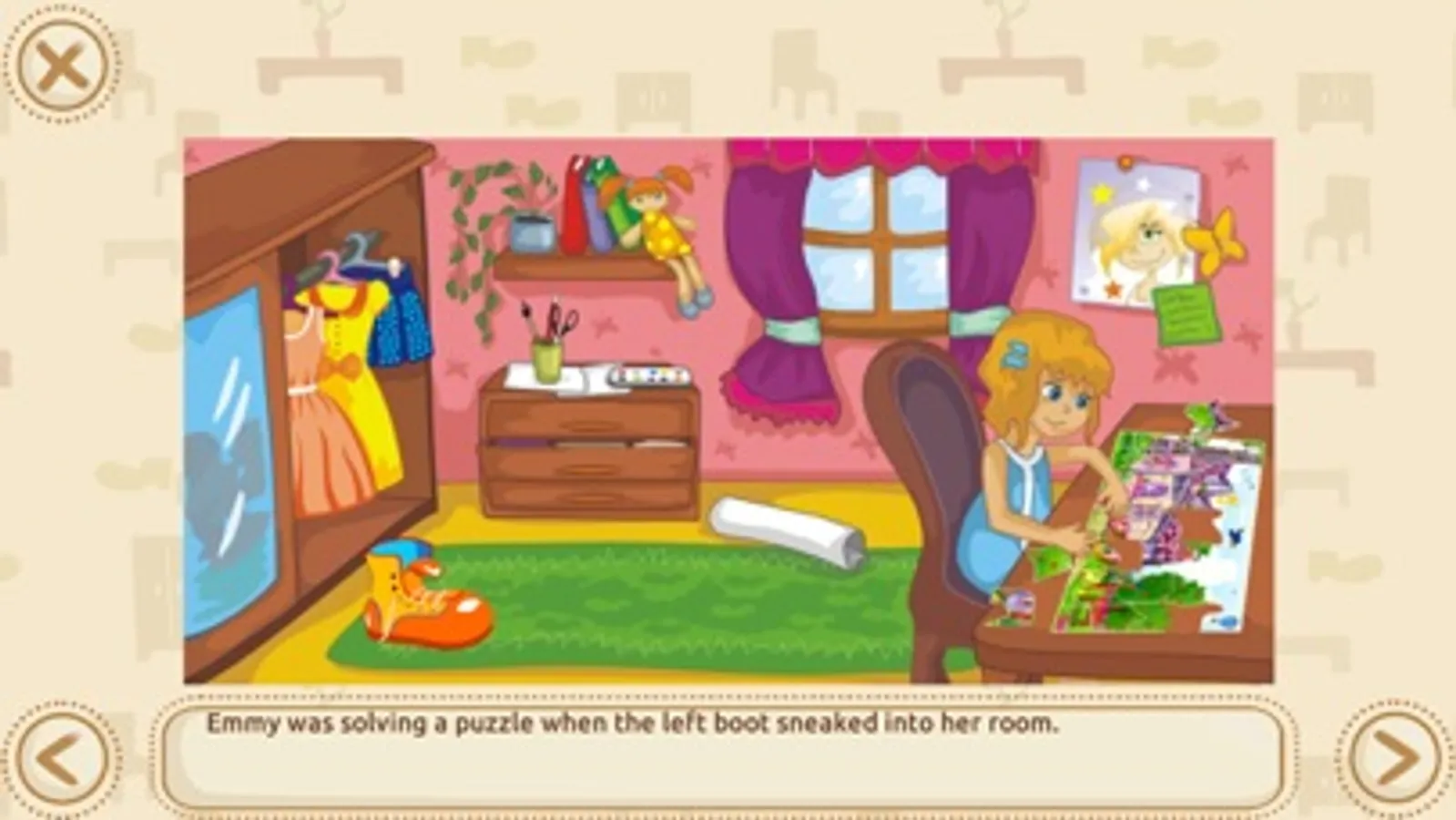 While searching for its brother, the left boot meets various furniture, clothes, kitchen items, toys and other things in the house. The plot includes educational tasks and mini-games. Toddlers and small kids will train memory and logic while doing them. The author of the game is a child psychologist who has worked with small kids all her life. In this application she has included much of the professional material used by professionals in their work with kids.